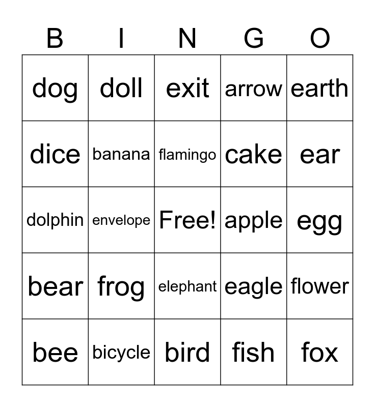 This bingo card has a free space and 42 words: flag, flamingo, fruit, frog, fish, flower, fox, eraser, exit, elephant, egg, ear, envelope, earth, eye, eagle, eggplant, dolphin, desk, doll, dice, duck, drum, dog, deer, camera, cake, candy, cactus, cat, carrot, bear, banana, bird, book, bee, bicycle, apple, alligator, ant, arrow and astronaut.