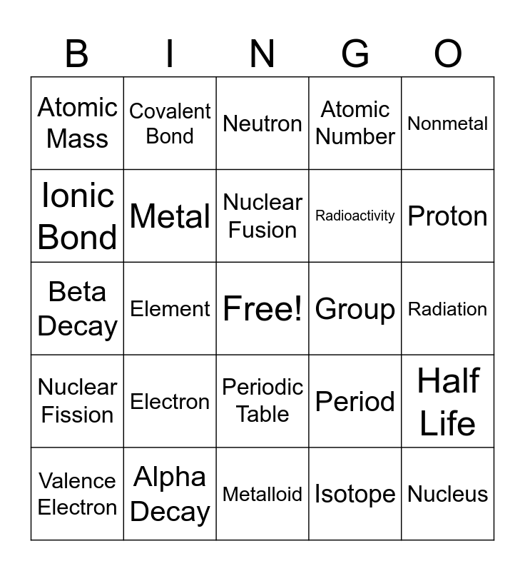 This bingo card has a free space and 24 words: Valence Electron, Electron, Nuclear Fusion, Isotope, Nonmetal, Atomic Mass, Covalent Bond, Neutron, Group, Radiation, Beta Decay, Metal, Period, Half Life, Ionic Bond, Alpha Decay, Metalloid, Atomic Number, Proton, Nuclear Fission, Element, Periodic Table, Radioactivity and Nucleus.