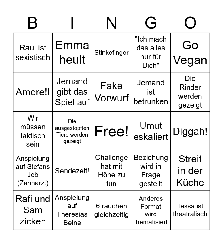 This bingo card has a free space and 25 words: Sendezeit!, 6 rauchen gleichzeitig, Fake Vorwurf, Rafi und Sam zicken, Go Vegan, Raul ist sexistisch, Amore!!, Emma heult, Umut eskaliert, Challenge hat mit Höhe zu tun, Jemand ist betrunken, Wir müssen taktisch sein, Beziehung wird in Frage gestellt, Streit in der Küche, Jemand gibt das Spiel auf, Allgemeinwissen fehlt, Diggah!, Stinkefinger, Die Rinder werden gezeigt, Die ausgestopften Tiere werden gezeigt, Tessa ist theatralisch, Anspielung auf Theresias Beine, Anspielung auf Stefans Job (Zahnarzt), "Ich mach das alles nur für Dich" and Anderes Format wird thematisiert.