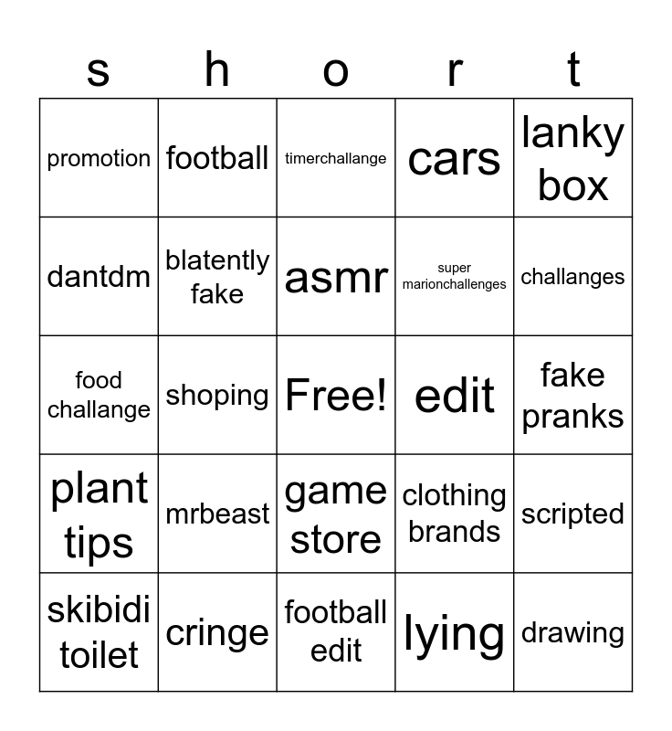 This bingo card has a free space and 24 words: mrbeast, cringe, asmr, skibidi toilet, lanky box, promotion, dantdm, football, edit, game store, super marionchallenges, food challange, clothing brands, scripted, blatently fake, lying, fake pranks, timerchallange, challanges, shoping, drawing, plant tips, cars and football edit.