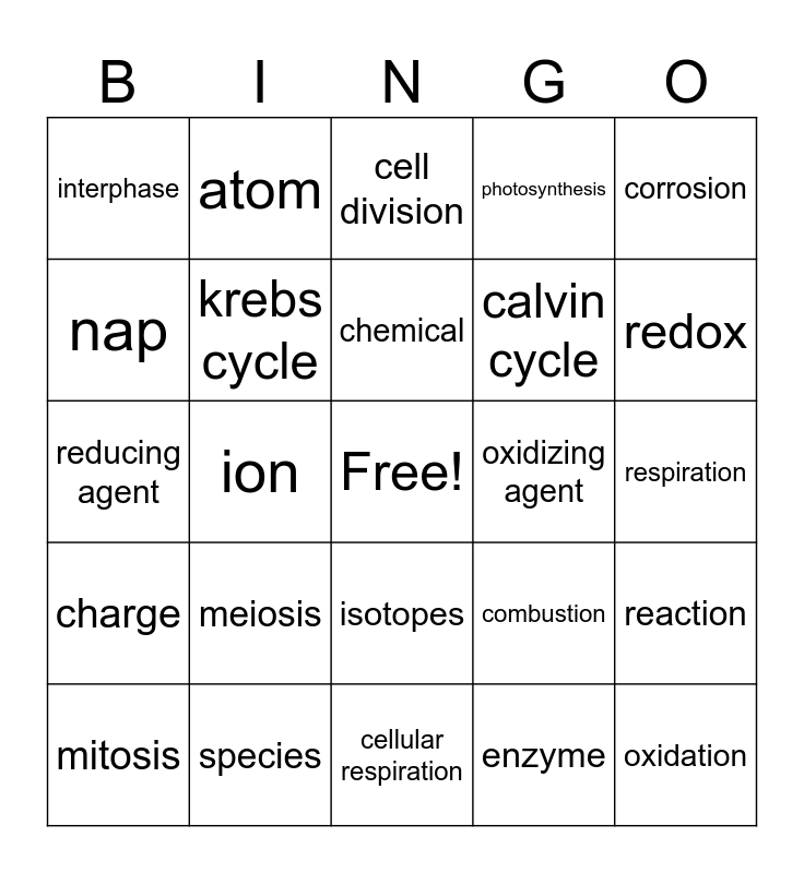 This bingo card has a free space and 28 words: reaction, substrate, calvin cycle, enzyme, nap, cell division, atom, charge, oxidizing agent, mitosis, reducing agent, photosynthesis, species, cellular respiration, redox, reduction, meiosis, krebs cycle, chemical, isotopes, interphase, electrons, oxidation, ion, respiration, combustion, corrosion and rusting.