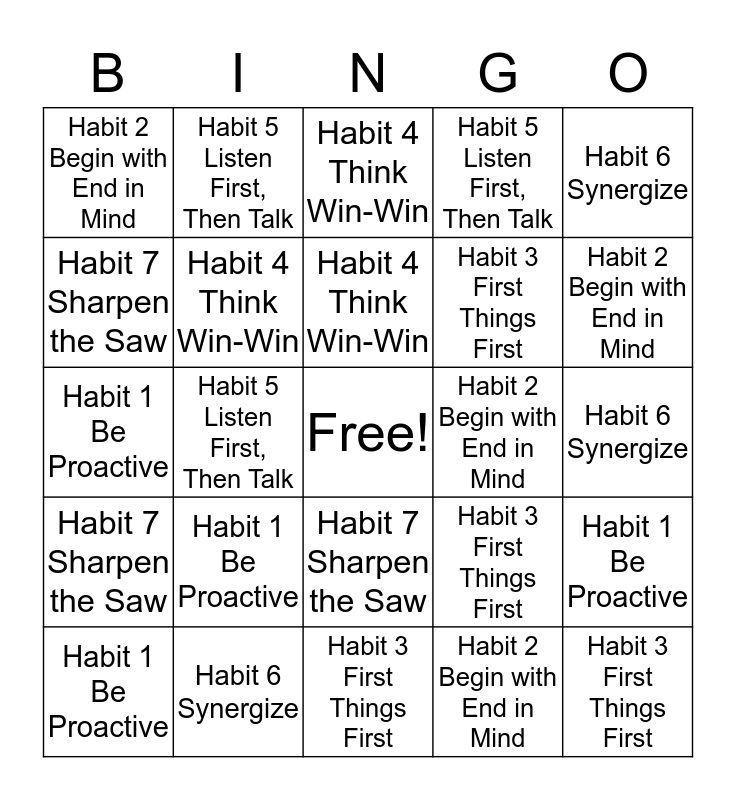 This bingo card has a free space and 24 words: Habit 1 Be Proactive, Habit 6 Synergize, Habit 4 Think Win-Win, Habit 1 Be Proactive, Habit 6 Synergize, Habit 2 Begin with End in Mind, Habit 7 Sharpen the Saw, Habit 5 Listen First, Then Talk, Habit 2 Begin with End in Mind, Habit 7 Sharpen the Saw, Habit 3 First Things First, Habit 1 Be Proactive, Habit 3 First Things First, Habit 1 Be Proactive, Habit 4 Think Win-Win, Habit 2 Begin with End in Mind, Habit 6 Synergize, Habit 4 Think Win-Win, Habit 2 Begin with End in Mind, Habit 5 Listen First, Then Talk, Habit 3 First Things First, Habit 7 Sharpen the Saw, Habit 5 Listen First, Then Talk and Habit 3 First Things First.