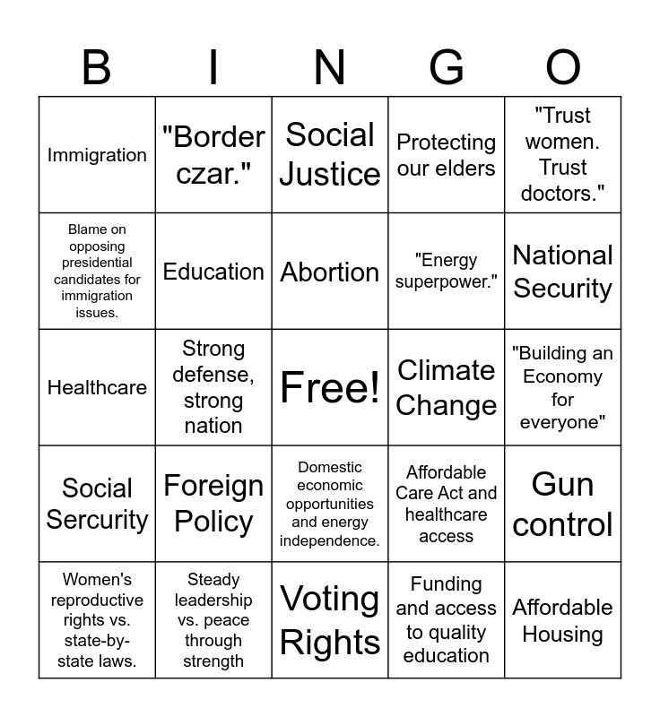 This bingo card has a free space and 24 words: Foreign Policy, Steady leadership vs. peace through strength, Abortion, Women's reproductive rights vs. state-by-state laws., "Trust women. Trust doctors.", Immigration, Blame on opposing presidential candidates for immigration issues., "Border czar.", Climate Change, Domestic economic opportunities and energy independence., "Energy superpower.", Healthcare, Affordable Care Act and healthcare access, Gun control, Education, Funding and access to quality education, "Building an Economy for everyone", Social Justice, National Security, Strong defense, strong nation, Affordable Housing, Social Sercurity, Protecting our elders and Voting Rights.