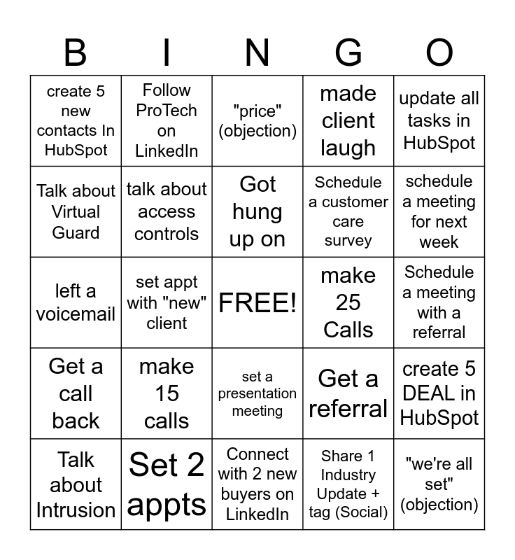 This bingo card has a free space and 24 words: make 15 calls, Set 2 appts, Got hung up on, Talk about Intrusion, update all tasks in HubSpot, create 5 new contacts In HubSpot, Talk about Virtual Guard, Follow ProTech on LinkedIn, make 25 Calls, set a presentation meeting, Schedule a customer care survey, left a voicemail, Get a referral, create 5 DEAL in HubSpot, talk about access controls, Share 1 Industry Update + tag (Social), Schedule a meeting with a referral, "price" (objection), schedule a meeting for next week, set appt with "new" client, "we're all set" (objection), Get a call back, made client laugh and Connect with 2 new buyers on LinkedIn.