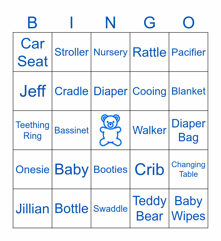 This bingo card has a free space and 24 words: Baby, Bottle, Diaper, Jillian, Pacifier, Car Seat, Jeff, Stroller, Walker, Booties, Cooing, Teething Ring, Crib, Changing Table, Cradle, Teddy Bear, Diaper Bag, Nursery, Blanket, Bassinet, Baby Wipes, Onesie, Rattle and Swaddle.