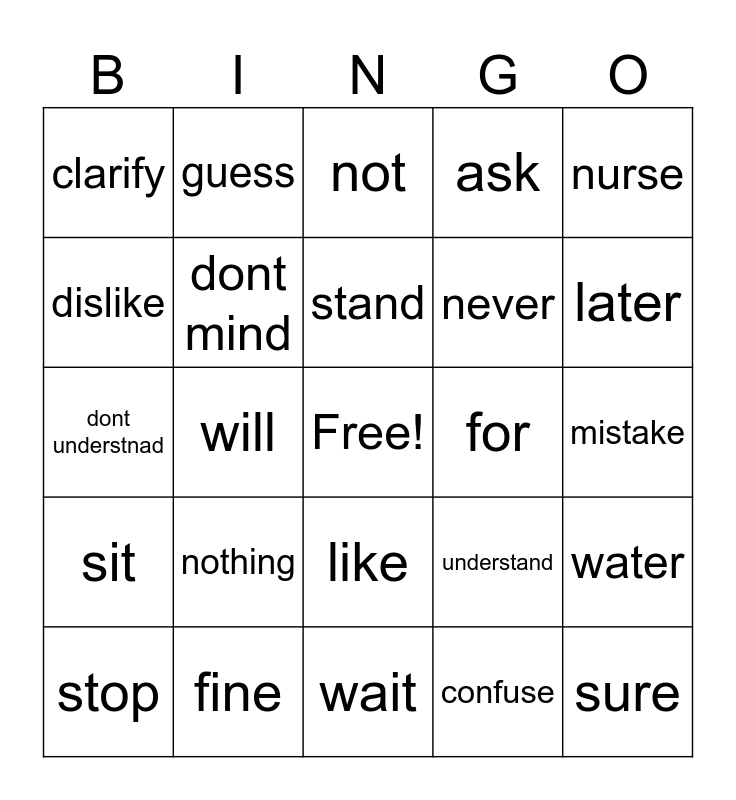 This bingo card has a free space and 24 words: nothing, fine, stand, stop, nurse, clarify, dislike, guess, for, like, never, dont understnad, understand, water, dont mind, confuse, mistake, not, later, will, sure, sit, ask and wait.