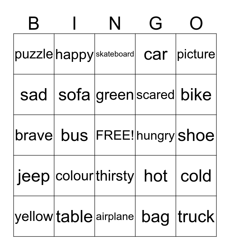 This bingo card has a free space and 24 words: colour, table, green, yellow, picture, puzzle, sad, happy, hungry, thirsty, scared, brave, hot, cold, sofa, bag, shoe, skateboard, bike, bus, truck, jeep, car and airplane.