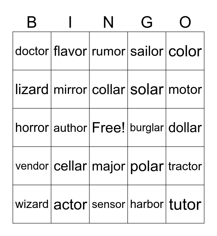 This bingo card has a free space and 24 words: cellar, actor, collar, wizard, color, doctor, lizard, flavor, burglar, major, solar, horror, polar, tractor, mirror, harbor, dollar, rumor, motor, author, tutor, vendor, sailor and sensor.