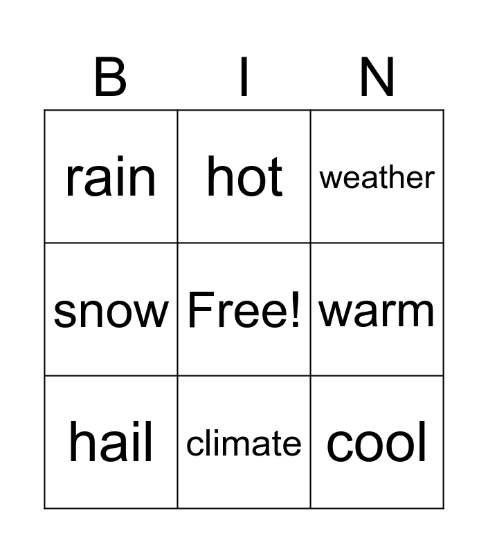 This bingo card has a free space and 12 words: temperature, cold, cool, warm, hot, weather, climate, precipitation, rain, snow, hail and sleet.