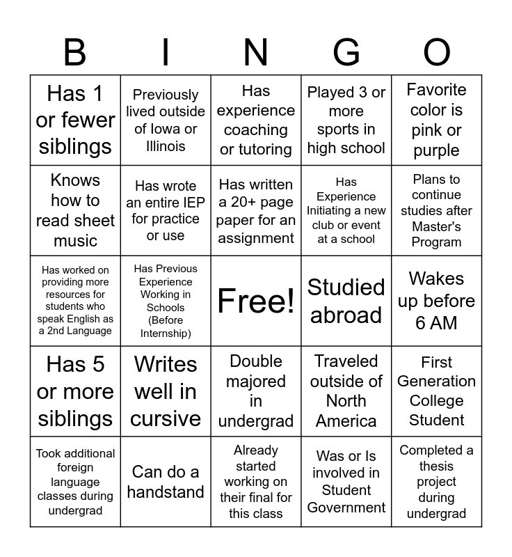 This bingo card has a free space and 27 words: Traveled outside of North America, Worked or Volunteered for a homeless shelter, Has Experience Initiating a new club or event at a school, Already started working on their final for this class, Knows how to read sheet music, Has experience coaching or tutoring, Previously lived outside of Iowa or Illinois, Has 5 or more siblings, Studied abroad, First Generation College Student, Has worked on providing more resources for students who speak English as a 2nd Language, Played 3 or more sports in high school, Took additional foreign language classes during undergrad, Can do a handstand, Plans to continue studies after Master's Program, Majored or minored in Psychology, Has wrote an entire IEP for practice or use, Has written a 20+ page paper for an assignment, Writes well in cursive, Has 1 or fewer siblings, Wakes up before 6 AM, Was or Is involved in Student Government, Has Previous Experience Working in Schools (Before Internship), Completed a thesis project during undergrad, Double majored in undergrad, Favorite color is pink or purple and Reads for fun (while enrolled in classes).