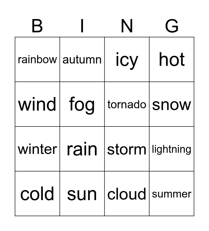 This bingo card has 17 words: cloud, cold, icy, rainbow, rain, hot, lightning, tornado, snow, fog, sun, storm, wind, autumn, winter, spring and summer.
