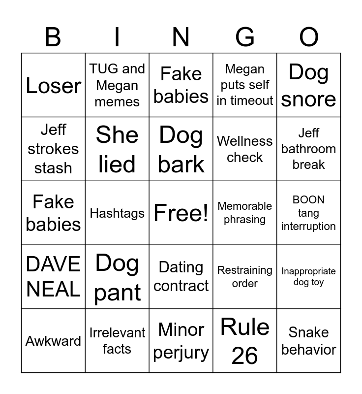 This bingo card has a free space and 29 words: Awkward, Crazy claims, Hashtags, Sanctions, Loser, Fake babies, She lied, Dog pant, Memorable phrasing, Irrelevant facts, BOON tang interruption, Snake behavior, Minor perjury, Rule 26, Jeff bathroom break, Oral arguments, Dating contract, DAVE NEAL, Dog snore, Fake babies, Restraining order, Cult, Wellness check, Jeff strokes stash, Megan puts self in timeout, TUG and Megan memes, Inappropriate dog toy, Dog bark and Hair talk.