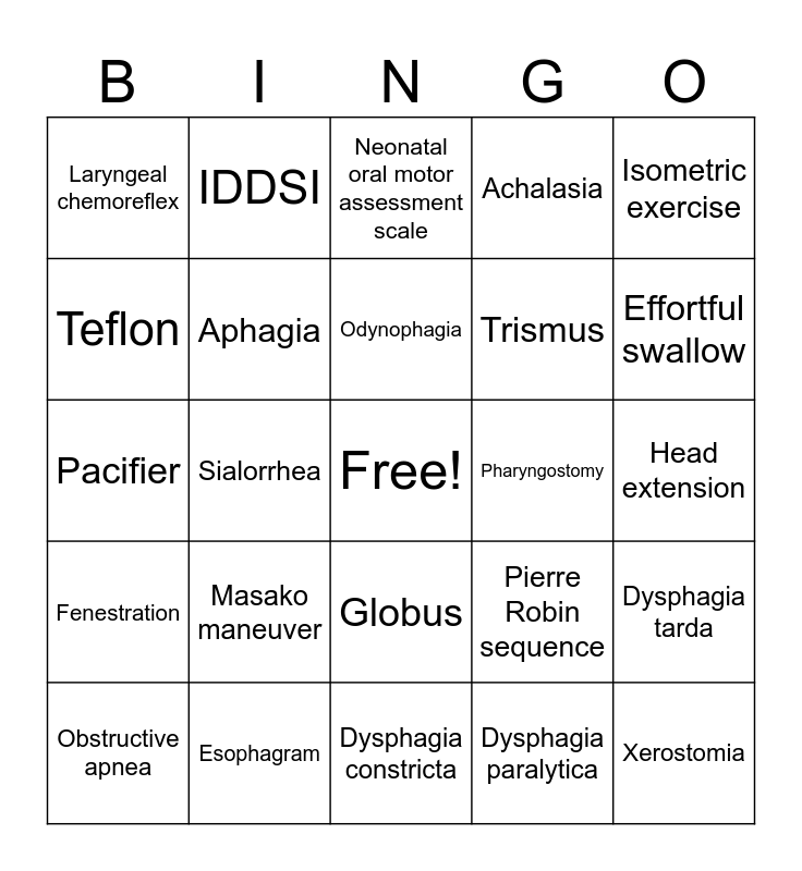 This bingo card has a free space and 25 words: Masako maneuver, Dysphagia constricta, Odynophagia, Obstructive apnea, Isometric exercise, Laryngeal chemoreflex, Teflon, IDDSI, Pharyngostomy, Globus, Trismus, Pacifier, Pierre Robin sequence, Dysphagia tarda, Aphagia, Dysphagia lusoria, Head extension, Neonatal oral motor assessment scale, Effortful swallow, Sialorrhea, Xerostomia, Esophagram, Fenestration, Achalasia and Dysphagia paralytica.