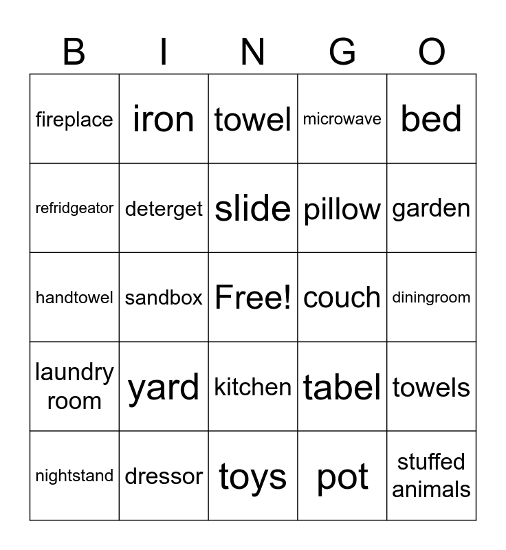 This bingo card has a free space and 54 words: house, laundry room, bedroom, bathroom, kitchen, oven, microwave, stove, refridgeator, blanket, fireplace, freezer, dressor, nightstand, lamp, toys, stuffed animals, pillow, bedsheets, diningroom, tabel, lamp, couch, bed, hamper, iron, spoons, forks, knives, pot, pan, dishes, plates, cups, towel, washcloth, handtowel, towels, bathsoap, deterget, dishsoap, pool, rake, shovel, yard, front yard, back yard, swing, slide, sandbox, garden, flowers, washer and dryer.