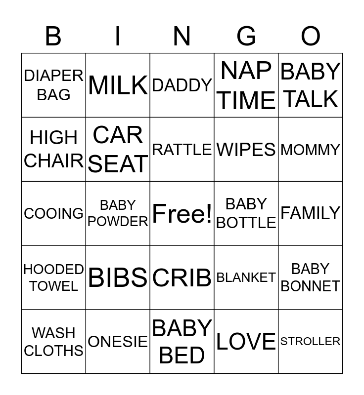 This bingo card has a free space and 24 words: BIBS, ONESIE, RATTLE, WASH CLOTHS, BABY TALK, DIAPER BAG, HIGH CHAIR, MILK, BABY BOTTLE, CRIB, WIPES, COOING, BLANKET, BABY BONNET, CAR SEAT, LOVE, FAMILY, DADDY, MOMMY, BABY POWDER, STROLLER, HOODED TOWEL, NAP TIME and BABY BED.