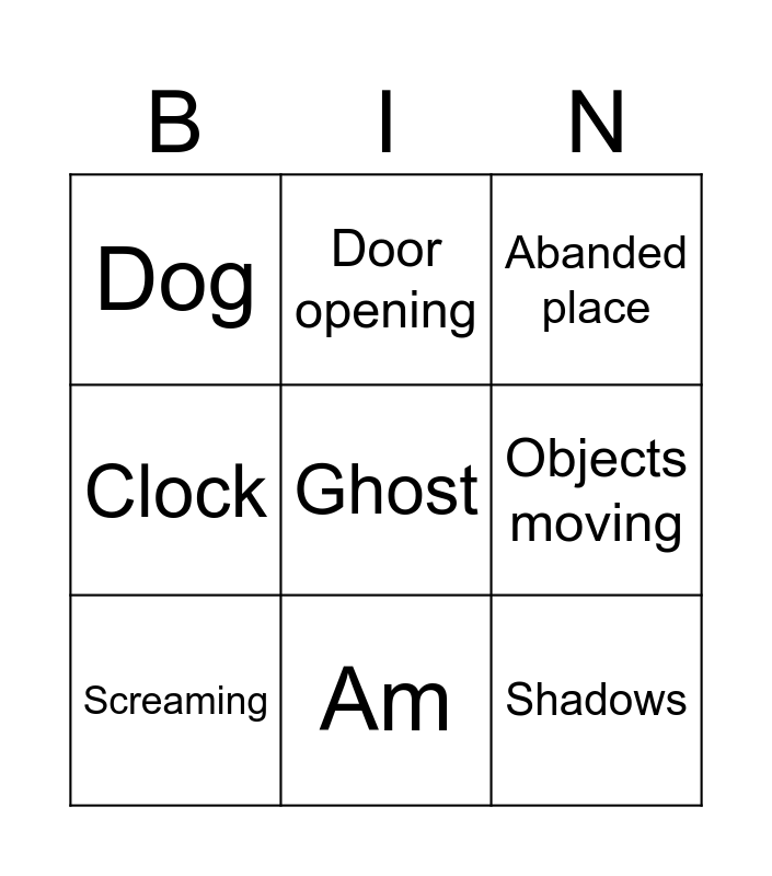 This bingo card has a free space and 8 words: Objects moving, Abanded place, Door opening, Screaming, Dog, Shadows, Clock and Am.