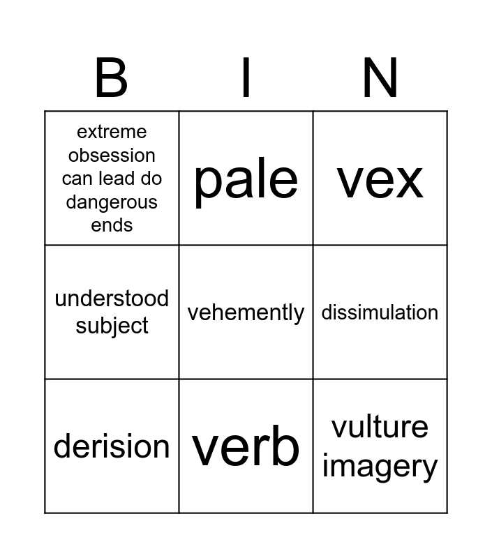 This bingo card has a free space and 11 words: noun, verb, vulture imagery, derision, pale, vex, dissimulation, inverted order, understood subject, extreme obsession can lead do dangerous ends and 1800s, an empty house, midnight.