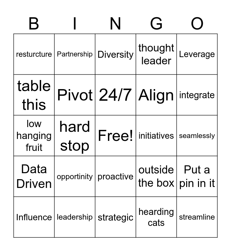 This bingo card has a free space and 34 words: In the weeds, hearding cats, Kick the can down the road, Work smarter, Data Driven, Pivot, Leverage, Influence, Partnership, Collaborative, 24/7, Diversity, enabling, facilitating, initiatives, integrate, leadership, low hanging fruit, opportinity, outside the box, proactive, reengineer, resturcture, seamlessly, strategic, streamline, thought leader, touch base, Align, table this, deep dive, hard stop, Put a pin in it and Circle back.
