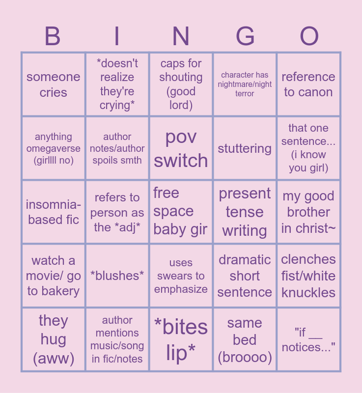 This bingo card has a free space and 46 words: "__ needs a hug", "if __ notices...", "no beta we die like __" (pardon?), *bites lip*, *blushes*, *digs fingernails into palms*, *doesn't realize they're crying*, *releases breath they didn't know they were holding*, anything omegaverse (girllll no), author has a fav word/sentence, author notes/author spoils smth, character has nightmare/night terror, clenches fist/white knuckles, dramatic short sentence, height difference (bonus if it's not canon), nicknames (pleaseeeee), pov switch, present tense writing, random double spaceeee, reference to canon, refers to person as the *adj*, same bed (broooo), someone cries, stuttering, texting / textfic, that one sentence... (i know you girl), they hug (aww), typo, uses swears to emphasize, watch a movie/ go to bakery, describes unique canon attribute of character, character has insomnia, emo ahh happy ending, enemies to lovers, randomly specific snack/food, author mentions music/song in fic/notes, my good brother in christ~, bickering (brotha), qUiRkY contact name in textfic, you cant reciprocate i got delicious taste, someone faints, caps for shouting (good lord), insomnia-based fic, childish gambinoo, character is just really emo and sad and depressed and tear soaked shirt.