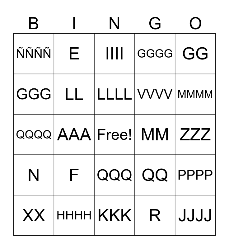 This bingo card has a free space and 108 words: A, AA, AAA, AAAA, B, BB, BBB, BBBB, C, CC, CCC, CCCC, D, DD, DDD, DDDD, E, EE, EEE, EEEE, F, FF, FFF, FFFF, G, GG, GGG, GGGG, H, HH, HHH, HHHH, I, II, III, IIII, J, JJ, JJJ, JJJJ, K, KK, KKK, KKKK, L, LL, LLL, LLLL, M, MM, MMM, MMMM, N, NN, NNN, NNNN, Ñ, ÑÑ, ÑÑÑ, ÑÑÑÑ, O, OO, OOO, OOOO, P, PP, PPP, PPPP, Q, QQ, QQQ, QQQQ, R, RR, RRR, RRRR, S, SS, SSS, SSSS, T, TT, TTT, TTTT, U, UU, UUU, UUUU, V, VV, VVV, VVVV, W, WW, WWW, WWWW, X, XX, XXX, XXXX, Y, YY, YYY, YYYY, Z, ZZ, ZZZ and ZZZZ.
