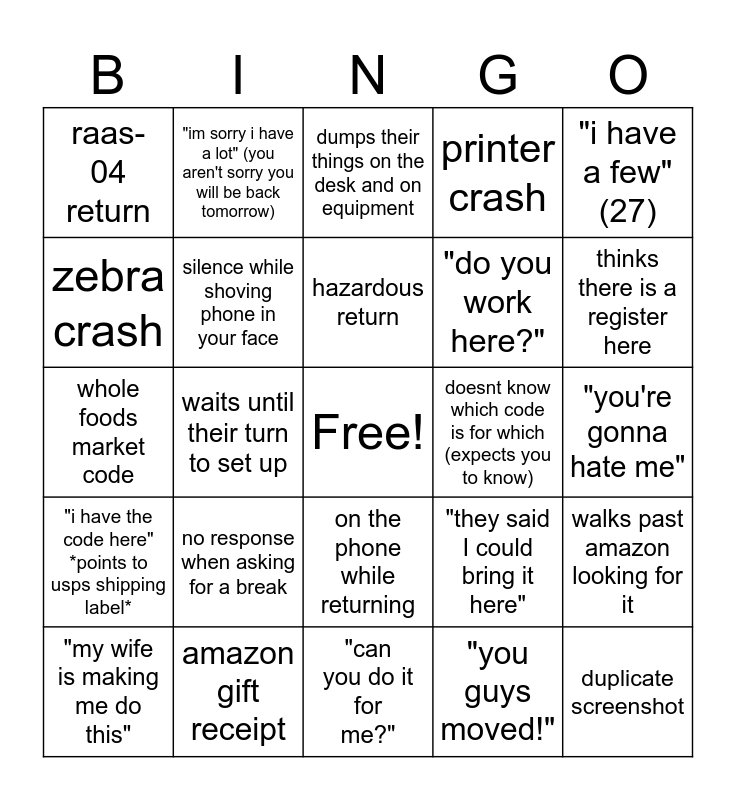 This bingo card has a free space and 24 words: no response when asking for a break, amazon gift receipt, hazardous return, "my wife is making me do this", "i have a few" (27), raas-04 return, zebra crash, "im sorry i have a lot" (you aren't sorry you will be back tomorrow), doesnt know which code is for which (expects you to know), on the phone while returning, "do you work here?", whole foods market code, "they said I could bring it here", walks past amazon looking for it, silence while shoving phone in your face, "you guys moved!", "you're gonna hate me", dumps their things on the desk and on equipment, thinks there is a register here, waits until their turn to set up, duplicate screenshot, "i have the code here" *points to usps shipping label*, printer crash and "can you do it for me?".