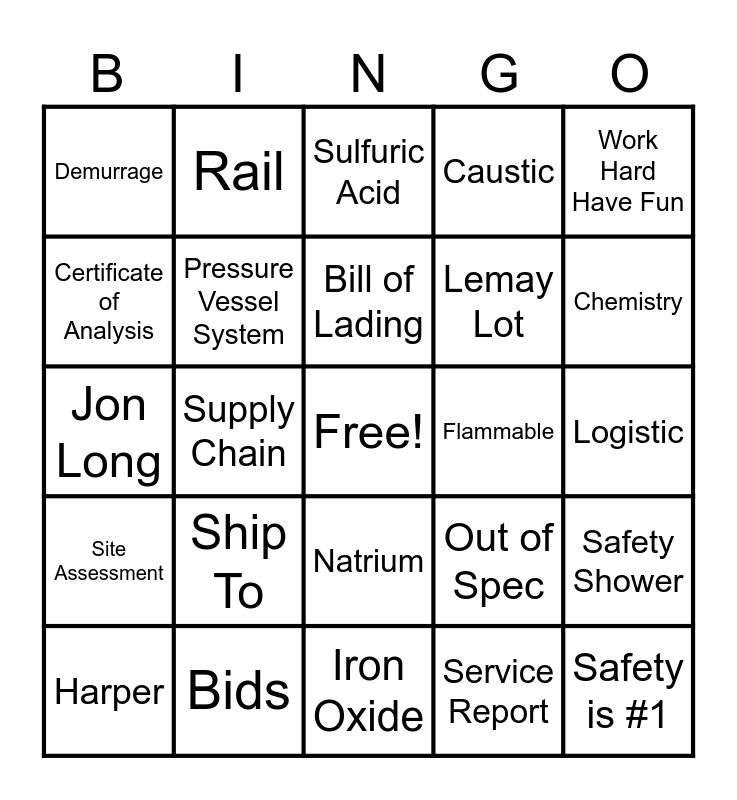 This bingo card has a free space and 77 words: Chemicals, Nicholson Nine, Sulfuric Acid, Sodium Bisulfite, Ferric Chloride, Ferrous Chloride, Sodium Dioxide, Transportation, Nolwood, Solutions, Technologies, Minibulk, Bill of Lading, Certificate of Analysis, Safety Data Sheet, Supply Chain, Detroit, Safety is #1, We are Family, Work Hard Have Fun, Hazmat, Jon Long, Pressure Vessel System, Rail, Caustic, Ton, Pound, Kilogram, Closing, Weight Ticket, Semi-truck, Trailer, Heel, Out of Spec, Chemistry, Lemay Lot, Adage, TMS, Logistic, Service Report, Double Checks, Chicago, Buffalo, Benson, Rejected Load, Nick’s Place, Harper, Demurrage, CPU, Invoices, Copley, Natrium, Drums, Tender, Accept, Waste Water Treatment, Steel, Spent, Adage Service Request, Bill To, Ship To, Freight Terms, Carrier, Purchase Order, Allocate, Etchant, Corrosive, Flammable, Pickle Liquor, Explosives, Eye Wash, Safety Shower, Site Assessment, Bids, Teams, Iron Oxide and Regenerated Acid.