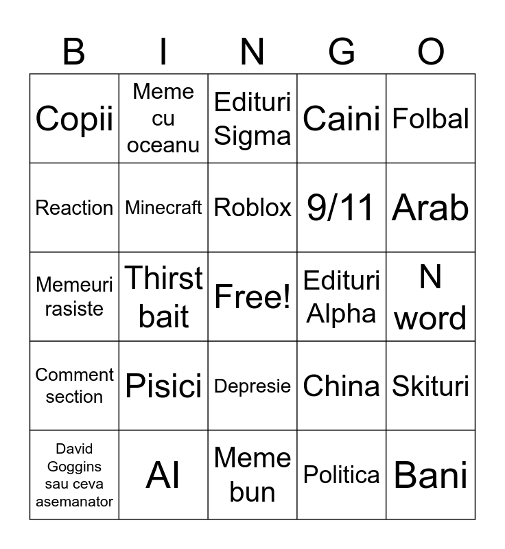 This bingo card has a free space and 24 words: Pisici, AI, Roblox, David Goggins sau ceva asemanator, Folbal, Copii, Reaction, Meme cu oceanu, Edituri Alpha, Depresie, 9/11, Memeuri rasiste, China, Skituri, Minecraft, Politica, N word, Edituri Sigma, Arab, Thirst bait, Bani, Comment section, Caini and Meme bun.