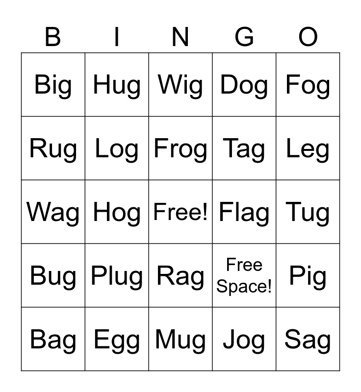 This bingo card has a free space and 25 words: Plug, Mug, Frog, Bag, Fog, Big, Rug, Hug, Flag, Rag, Tag, Wag, Free Space!, Pig, Log, Dig, Tug, Wig, Leg, Hog, Sag, Egg, Bug, Dog and Jog.