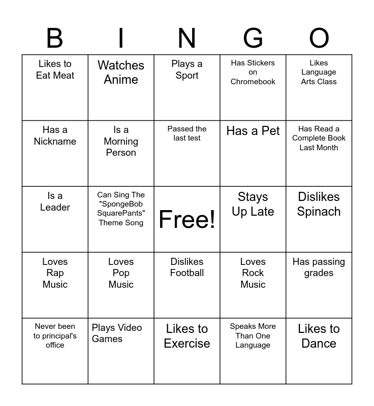 This bingo card has a free space and 30 words: Plays Video Games, Likes to Draw, Can Sing The "SpongeBob SquarePants" Theme Song, Has More Than Three Brothers/Sisters, Likes to Eat Meat, Plays a Sport, Is a Morning Person, Dislikes Football, Stays Up Late, Likes to Exercise, Dislikes Spinach, Likes to Dance, Speaks More Than One Language, Likes Math Class, Has Read a Complete Book Last Month, Loves Country Music, Loves Rock Music, Loves Rap Music, Loves Pop Music, Likes Language Arts Class, Is a Leader, Has Good Handwriting, Watches Anime, Has a Pet, Has a Nickname, Has Stickers on Chromebook, Has passing grades, Never been to principal's office, Passed the last test and Wears Glass.