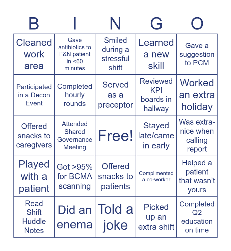 This bingo card has a free space and 53 words: Completed QI education on time, Completed Q2 education on time, Got a patient compliment from NRC, Picked up an extra shift, Got >95% for BCMA scanning, Read/attended/watched video for every Staff Meeting in 2024, Gave antibiotics to F&N patient in <60 minutes, Completed a Med History, Participated in a Decon Event, Completed a Temp History, Completed hourly rounds, Helped a co-worker, Helped a patient that wasn’t yours, Complimented a co-worker, Read a Tidbit Tuesday, Read Shift Huddle Notes, Served as a preceptor, Stayed late/came in early, Completed engagement survey, Gave a suggestion to PCM, Attended Shared Governance Meeting, Participated in any Nursing Quality Project, Reviewed KPI boards in hallway, Cleaned work area, Put up isolation signs, Did an enema, De-escalated an angry parent, Pursued extra education, Traded shift to help a co-worker, Worked an extra holiday, Made a mandatory move, Cleaned up blood or another body fluid, Picked up someone else’s mess, Bought a treat for a co-worker, Brought in snacks, Called Child Life, Learned a new skill, Told a joke, Smiled during a stressful shift, Confirmed a phone number (STD testing), Caught an error, Filled out a Safety Tracker, Was extra-nice when calling report, Did rounds in the WRs, Used/completed Triage Protocols, Offered snacks to patients, Placed a Facilities ticket, Placed an IT ticket, Offered snacks to caregivers, Played with a patient, Made a patient smile, Complimented a physician and Participated in Mock Code.