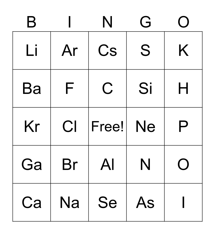 This bingo card has a free space and 24 words: Br, Na, C, Ca, K, Li, Ba, Ar, Ne, Al, Si, Kr, N, O, F, As, P, Cs, H, Cl, I, Ga, S and Se.