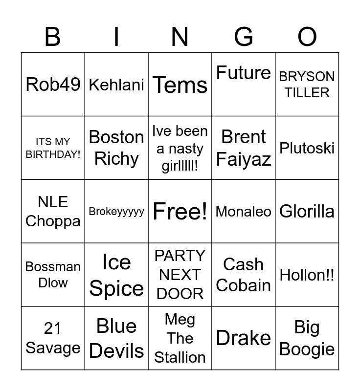 This bingo card has a free space and 27 words: Cash Cobain, Tommy Richman, Brent Faiyaz, Meg The Stallion, ITS MY BIRTHDAY!, Tems, Kehlani, Bossman Dlow, Monaleo, Hollon!!, NLE Choppa, Future, 21 Savage, Blue Devils, Plutoski, El Snappo, Boston Richy, Ive been a nasty girlllll!, Ice Spice, Rob49, Glorilla, Drake, Brokeyyyyy, Big Boogie, PARTY NEXT DOOR, BRYSON TILLER and GUNNA.