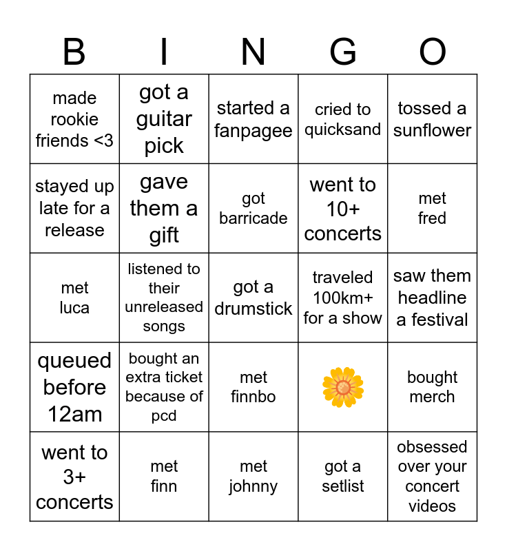 This bingo card has 25 words: bought an extra ticket because of pcd, met johnny, got barricade, went to 3+ concerts, tossed a sunflower, made rookie friends <3, stayed up late for a release, got a guitar pick, traveled 100km+ for a show, met finnbo, went to 10+ concerts, met luca, 🌼, bought merch, gave them a gift, obsessed over your concert videos, saw them headline a festival, started a fanpagee, met fred, listened to their unreleased songs, got a drumstick, met finn, queued before 12am, cried to quicksand and got a setlist.