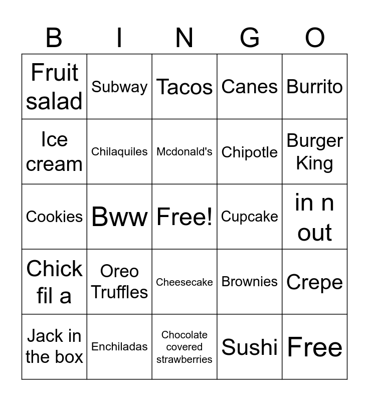 This bingo card has a free space and 25 words: Chick fil a, Enchiladas, Chocolate covered strawberries, Sushi, Burrito, Fruit salad, Subway, Tacos, Cupcake, Crepe, Ice cream, Chilaquiles, Pizza, Brownies, Burger King, Jack in the box, Bww, Mcdonald's, Chipotle, in n out, Cookies, Oreo Truffles, Cheesecake, Canes and Free.