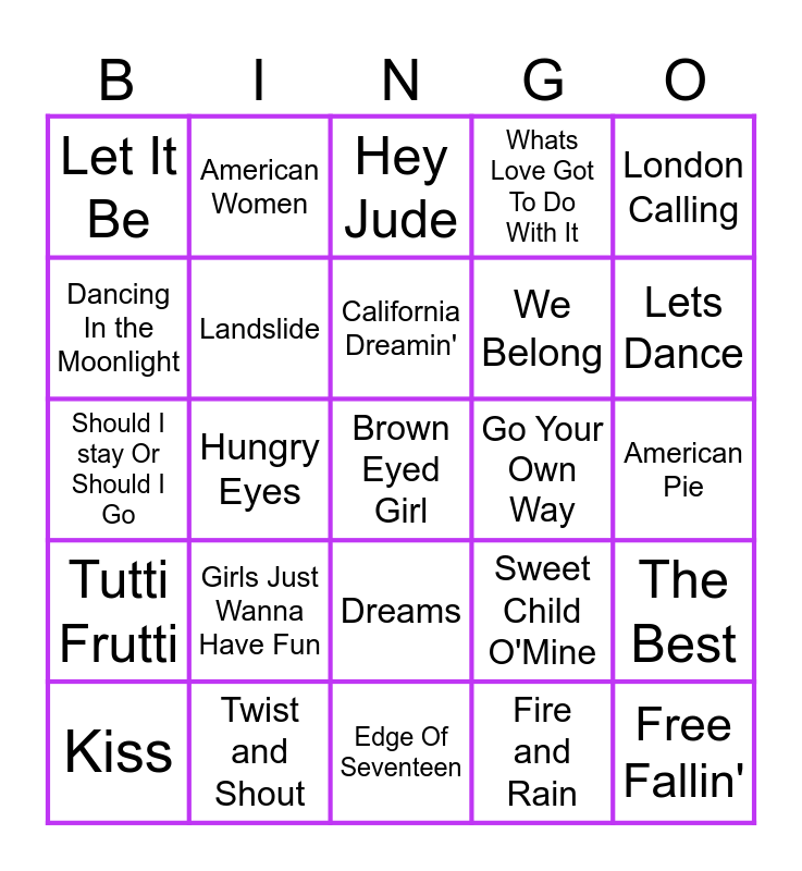 This bingo card has 30 words: Twist and Shout, I saw her standing there, Hungry Eyes, Help!, Let It Be, Hey Jude, Landslide, Dreams, Go Your Own Way, Edge Of Seventeen, American Pie, Brown Eyed Girl, Fire and Rain, Free Fallin', Lets Dance, Crazy Train, Sweet Child O'Mine, Tutti Frutti, Girls Just Wanna Have Fun, London Calling, Should I stay Or Should I Go, Sledgehammer, American Women, We Belong, Dancing In the Moonlight, Whats Love Got To Do With It, The Best, Kiss, California Dreamin' and Dust In The Wind.