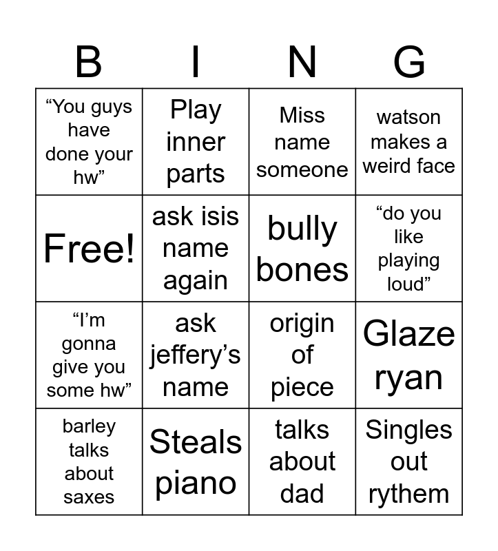 This bingo card has 16 words: Steals piano, Glaze ryan, Miss name someone, “You guys have done your hw”, “I’m gonna give you some hw”, Play inner parts, origin of piece, talks about dad, Free!, ask isis name again, barley talks about saxes, watson makes a weird face, ask jeffery’s name, “do you like playing loud”, bully bones and Singles out rythem.