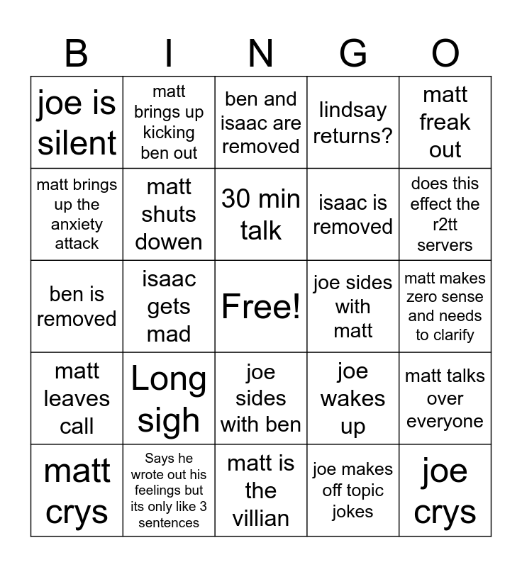 This bingo card has a free space and 24 words: Long sigh, Says he wrote out his feelings but its only like 3 sentences, 30 min talk, matt crys, matt freak out, joe is silent, matt brings up the anxiety attack, matt brings up kicking ben out, joe sides with matt, joe sides with ben, isaac is removed, ben is removed, joe wakes up, matt talks over everyone, matt shuts dowen, joe makes off topic jokes, matt makes zero sense and needs to clarify, ben and isaac are removed, does this effect the r2tt servers, isaac gets mad, joe crys, matt leaves call, lindsay returns? and matt is the villian.