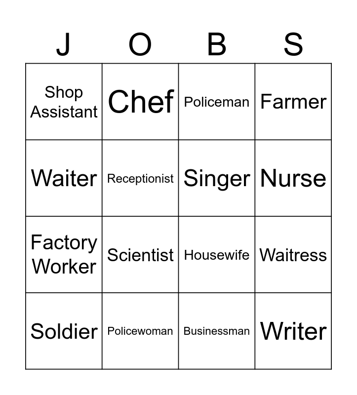 This bingo card has 24 words: Teacher, Doctor, Nurse, Journalist/Reporter, Waiter, Shop Assistant, Receptionist, Chef, Policewoman, Taxi Driver, Factory Worker, Housewife, Actor, Pilot, Singer, Hairdresser, Businessman, Policeman, Scientist, Waitress, Soldier, Writer, Farmer and Guide.