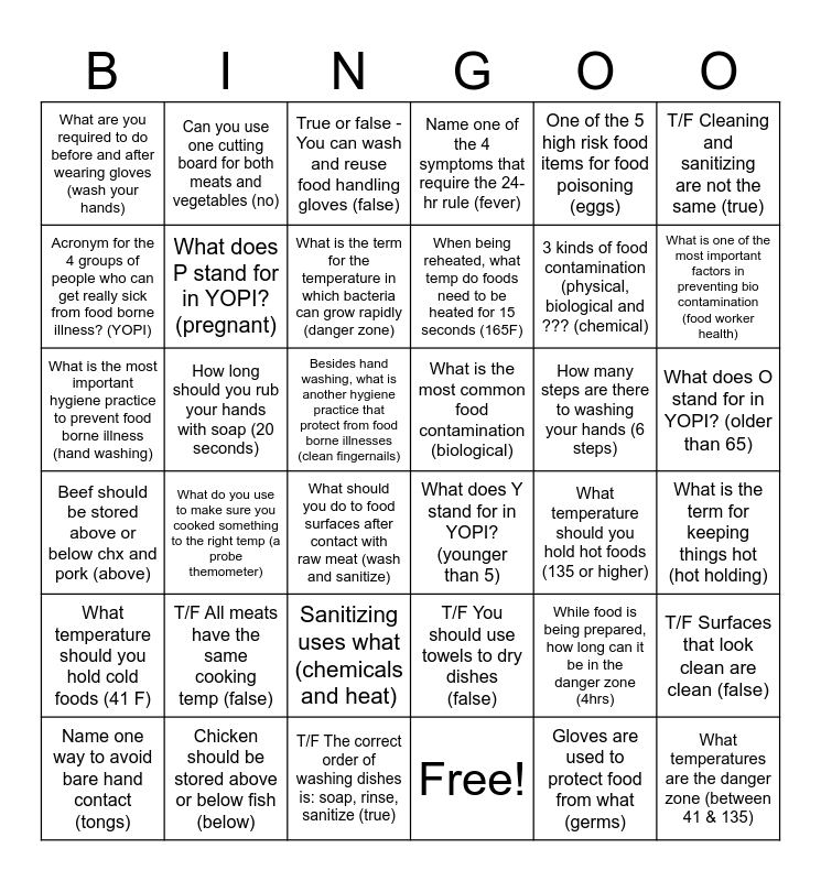 This bingo card has 41 words: Free!, 3 kinds of food contamination (physical, biological and ??? (chemical), Most important factor in food safety? (cleanliness), Acronym for the 4 groups of people who can get really sick from food borne illness? (YOPI), What does Y stand for in YOPI? (younger than 5), What does O stand for in YOPI? (older than 65), What does P stand for in YOPI? (pregnant), What does I stand for in YOPI? (immune compromise, One of the 5 high risk food items for food poisoning (eggs), What is the most common food contamination (biological), What is one of the most important factors in preventing bio contamination (food worker health), Name one of the 4 symptoms that require the 24-hr rule (fever), What is the most important hygiene practice to prevent food borne illness (hand washing), Besides hand washing, what is another hygiene practice that protect from food borne illnesses (clean fingernails), How long should you rub your hands with soap (20 seconds), How many steps are there to washing your hands (6 steps), Name one way to avoid bare hand contact (tongs), What are you required to do before and after wearing gloves (wash your hands), Gloves are used to protect food from what (germs), True or false - You can wash and reuse food handling gloves (false), What do you use to make sure you cooked something to the right temp (a probe themometer), What temperature should you hold cold foods (41 F), What temperature should you hold hot foods (135 or higher), What is the term for the temperature in which bacteria can grow rapidly (danger zone), What temperatures are the danger zone (between 41 & 135), While food is being prepared, how long can it be in the danger zone (4hrs), What is the term for keeping things hot (hot holding), What is the term for keeping things cold (cold holding), When being reheated, what temp do foods need to be heated for 15 seconds (165F), T/F All meats have the same cooking temp (false), What is the safest way to thaw frozen food (refrigerator), Can you use one cutting board for both meats and vegetables (no), What should you do to food surfaces after contact with raw meat (wash and sanitize), Chicken should be stored above or below fish (below), Beef should be stored above or below chx and pork (above), T/F Cleaning and sanitizing are not the same (true), Sanitizing uses what (chemicals and heat), T/F Surfaces that look clean are clean (false), T/F The correct order of washing dishes is: soap, rinse, sanitize (true), T/F You should use towels to dry dishes (false) and How should cups and bowls be stored (upside down).