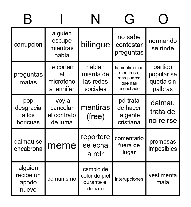 This bingo card has a free space and 30 words: comunismo, socialismo, "voy a cancelar el contrato de luma, reportere le parte el culo a alguien, corrupcion, bilingue, le cortan el microfono a jennifer, reportere se echa a reir, pd trata de hacer la gente cristiana, cambio de color de piel durante el debate, dalmau trata de no reirse, vestimenta mala, interupciones, faltas de respeto, partido popular se queda sin palbras, le cortan el microfono a javier, comentario fuera de lugar, dalmau se encabrona, meme, normando se rinde, pop desgracia a los boricuas, PNP desgracia a los boricuas, alguien escupe mientras habla, la mentira mas mentirosa, mas puerca que has escuchado, preguntas malas, no sabe contestar preguntas, promesas imposibles, alguien recibe un apodo nuevo, hablan mierda de las redes sociales and no entiende el termino feminicidio.