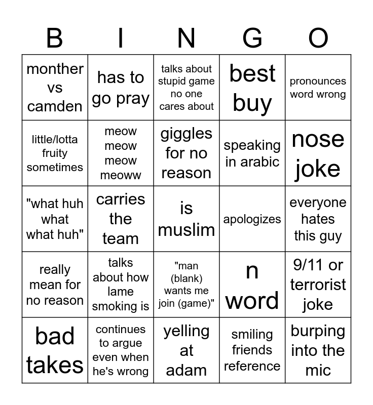 This bingo card has a free space and 27 words: n word, getting made fun of for being muslim, speaking in arabic, yelling at adam, little/lotta fruity sometimes, talks about stupid game no one cares about, has to go pray, really mean for no reason, apologizes, 9/11 or terrorist joke, "what huh what what huh", best buy, bad takes, continues to argue even when he's wrong, nose joke, asking/telling something's haram, meow meow meow meoww, giggles for no reason, talks about how lame smoking is, monther vs camden, everyone hates this guy, smiling friends reference, carries the team, burping into the mic, "man (blank) wants me join (game)", pronounces word wrong and "man i wanna play (something) rn".