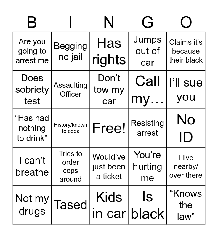 This bingo card has a free space and 36 words: You can’t search my car, Asks for supervisor, It’s in Illinois or Wisconsin, Assaulting Officer, You’re hurting me, I can’t breathe, Don’t tow my car, Has work tomorrow, Claims it’s because their black, Cuffs too tight, History/known to cops, Jumps out of car, Am I being detained, Resisting arrest, I’ll sue you, Are you going to arrest me, Outstanding warrant, Tries to order cops around, “Knows the law”, Has rights, No ID, I live nearby/ over there, Tased, Not my drugs, Kids in car, Begging no jail, “Has had nothing to drink”, Car crash, Call my…, Does sobriety test, Are you going to arrest me?, Shoplifter, Is black, Would’ve just been a ticket, I know…/ Do you know who I am and Just got out of jail.
