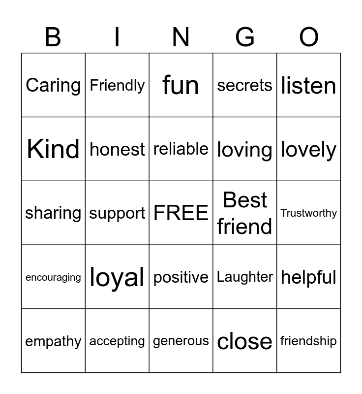 This bingo card has a free space and 24 words: loyal, accepting, reliable, empathy, listen, Caring, Kind, Friendly, Best friend, positive, loving, sharing, Laughter, helpful, honest, close, Trustworthy, fun, lovely, support, friendship, encouraging, secrets and generous.