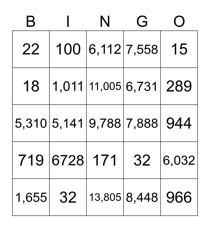This bingo card has 25 words: 6728, 13,805, 11,005, 1,655, 15, 22, 18, 100, 7,888, 171, 6,731, 5,310, 32, 6,032, 1,011, 966, 944, 6,112, 289, 5,141, 9,788, 32, 719, 7,558 and 8,448.