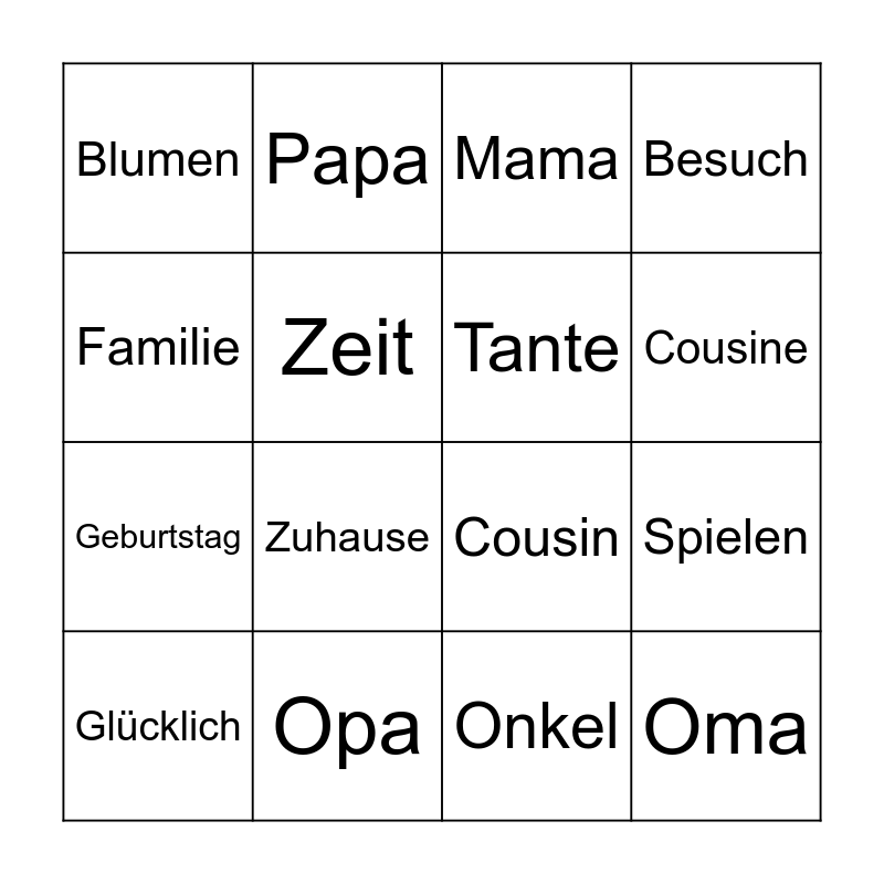 This bingo card has 16 words: Opa, Spielen, Mama, Blumen, Geburtstag, Papa, Cousin, Onkel, Familie, Zeit, Glücklich, Besuch, Zuhause, Cousine, Tante and Oma.