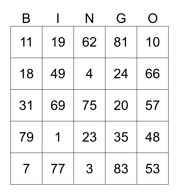 This bingo card has 25 words: 1, 3, 4, 7, 10, 11, 18, 19, 20, 23, 24, 31, 35, 48, 49, 53, 57, 62, 66, 69, 75, 77, 79, 81 and 83.