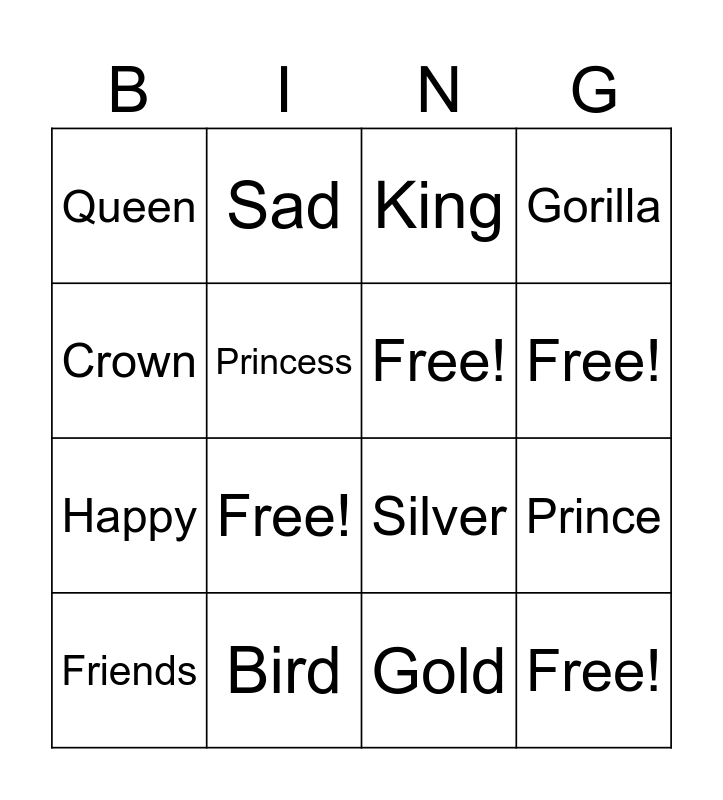 This bingo card has 16 words: Bird, Prince, King, Queen, Happy, Sad, Silver, Gold, Crown, Princess, Friends, Gorilla, Free!, Free!, Free! and Free!.