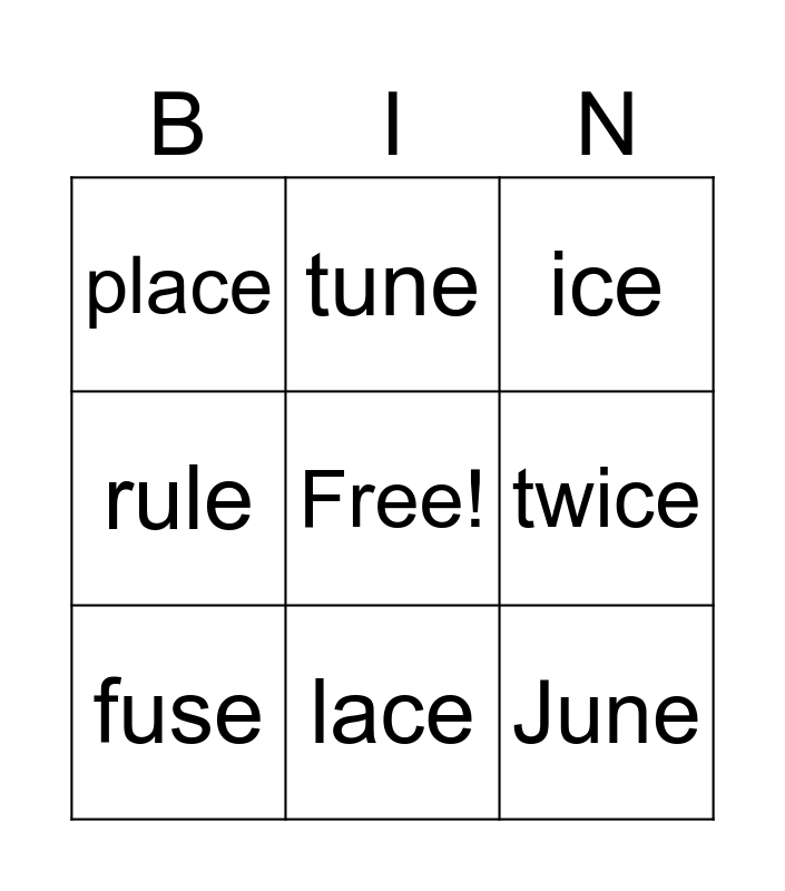 This bingo card has a free space and 14 words: cube, mute, fuse, tune, rule, June, nice, race, lace, place, spice, twice, ice and mice.
