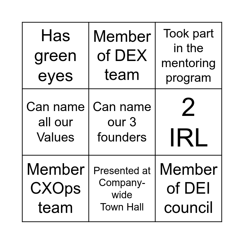 This bingo card has a free space and 8 words: 2 IRL, Took part in the mentoring program, Member of DEX team, Member CXOps team, Has green eyes, Member of DEI council, Can name all our Values and Presented at Company-wide Town Hall.