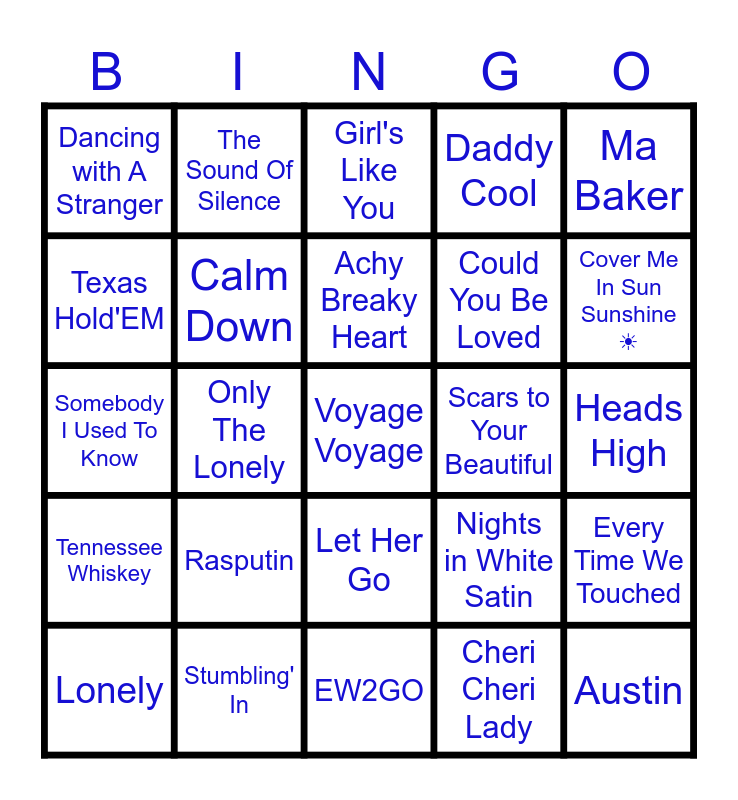 This bingo card has 30 words: Stumbling' In, Desire, Only The Lonely, Chandelier, Dancing with A Stranger, Girl's Like You, Calm Down, Let Her Go, Scars to Your Beautiful, EW2GO, Heads High, Voyage Voyage, Cheri Cheri Lady, Austin, Cover Me In Sun Sunshine ☀, Savage Love, Nights in White Satin, Tennessee Whiskey, Rasputin, Ma Baker, Somebody I Used To Know, The Best, The Sound Of Silence, Could You Be Loved, Texas Hold'EM, Daddy Cool, Every Time We Touched, Lonely, Achy Breaky Heart and Hey Baby.